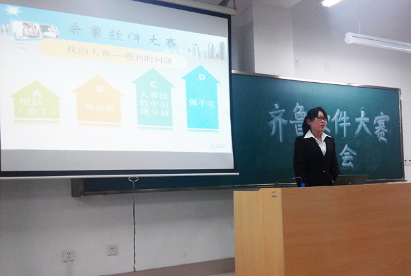2014年5月6日在济南职业学院进行第十二届齐鲁软件大赛的巡回演讲报告会,参加此次巡回演讲报告会的有组委会尚玉新老师,往届大赛一等奖获学生代表曲晓梅、王文珑、裴金亮和桑搏同学,参加报告会的还有济南职业学院200多名学生,经过大家认真的准备后,报告会在晚上6点五号教学楼5-2教室举行,报告会由尚老师主持。