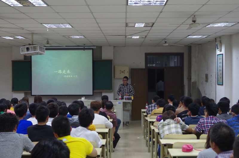 接着,获奖选手付乐颖进行了作品的精彩演示与演讲。他以幽默的语言向同学们详细介绍了大赛中有可能会遇到的困难以及应注意的问题,并指出团队精神和坚持不懈是取得好成绩的根本保证。接着获奖选手王洋介绍了大赛对他的成长以及工作的帮助,接着以大赛命题老师的身份给大家详细讲解了基于Python的应用与游戏开发这一命题。两位同学的精彩演讲燃起了同学们积极参赛的热情。接下来,命题老师陈亮博士介绍了城市定向运动的社会化应用这一命题,山东建筑大学杨磊教授也介绍了数字小区这一命题,两位老师的精彩演讲获得了同学们的阵阵掌声。