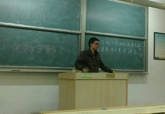 首先由科技创新协会嵌入式小组组长同时也是上一届齐鲁软件大赛一等奖获得者赵曾国对比赛的大体流程进行了详细的介绍,从组织队伍、确定选题、时间安排、文档书写、团队分工、软件设计技巧、说明视频录制等多个方面对比赛进行了剖析,是同学们对比赛有了比较全面的认识和了解,他幽默诙谐的语言也不时引起现场阵阵掌声。